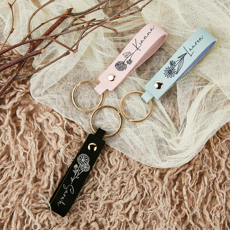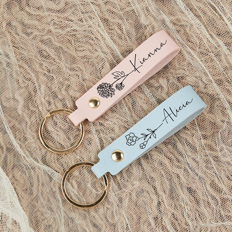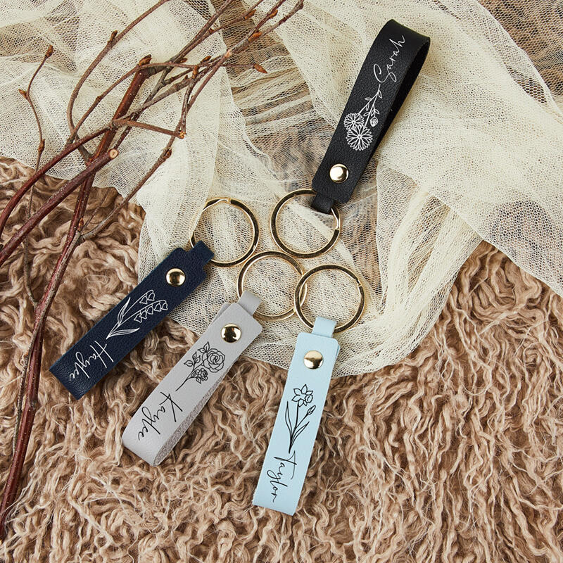 Personalized Leather Keychain with Custom Name and Birth Flower Attractive Gift for Her