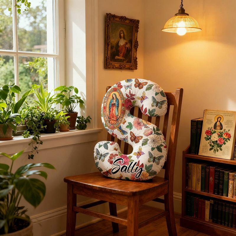 Personalized Letter-Shaped Pillow Virgin Mary Flower and Butterfly Design Elegant Gift for Her