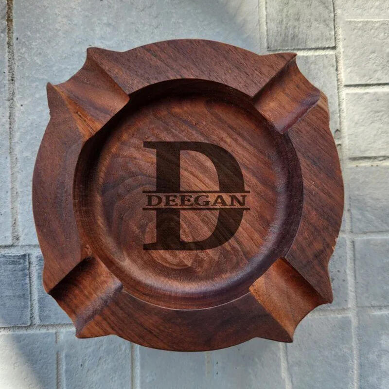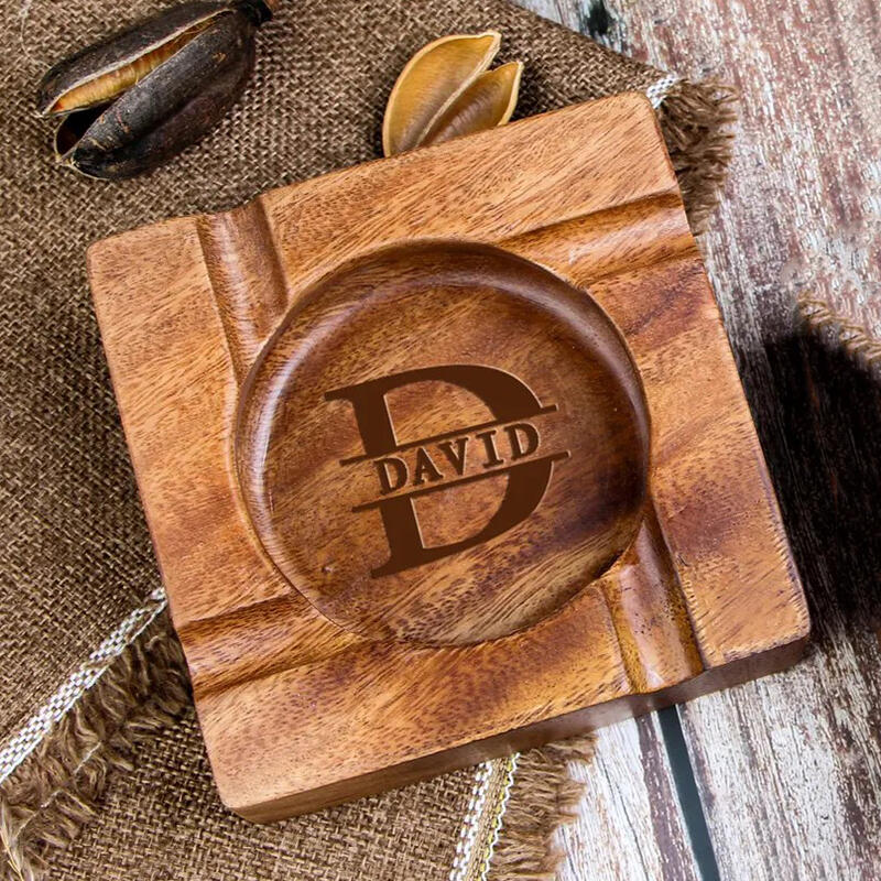 This wooden ashtray is a standout addition to any cigar lounge or man cave with custom engravings of your name. As you gently turn this exquisite wooden ashtray, you'll feel the warmth and unique texture of the wood. The single-cut engraved wood ensures stability, and the wide and deep grooves hold your cigars securely in place. The natural details of the wood grain give this cigar ashtray a unique look, making it a unique and classic addition to your cigar collection. They are made to last for years, and the finish matches the rest of the ashtray. You can also customize it with a letter to make this gift even more thoughtful, making it the perfect gift for smokers and non-smokers.